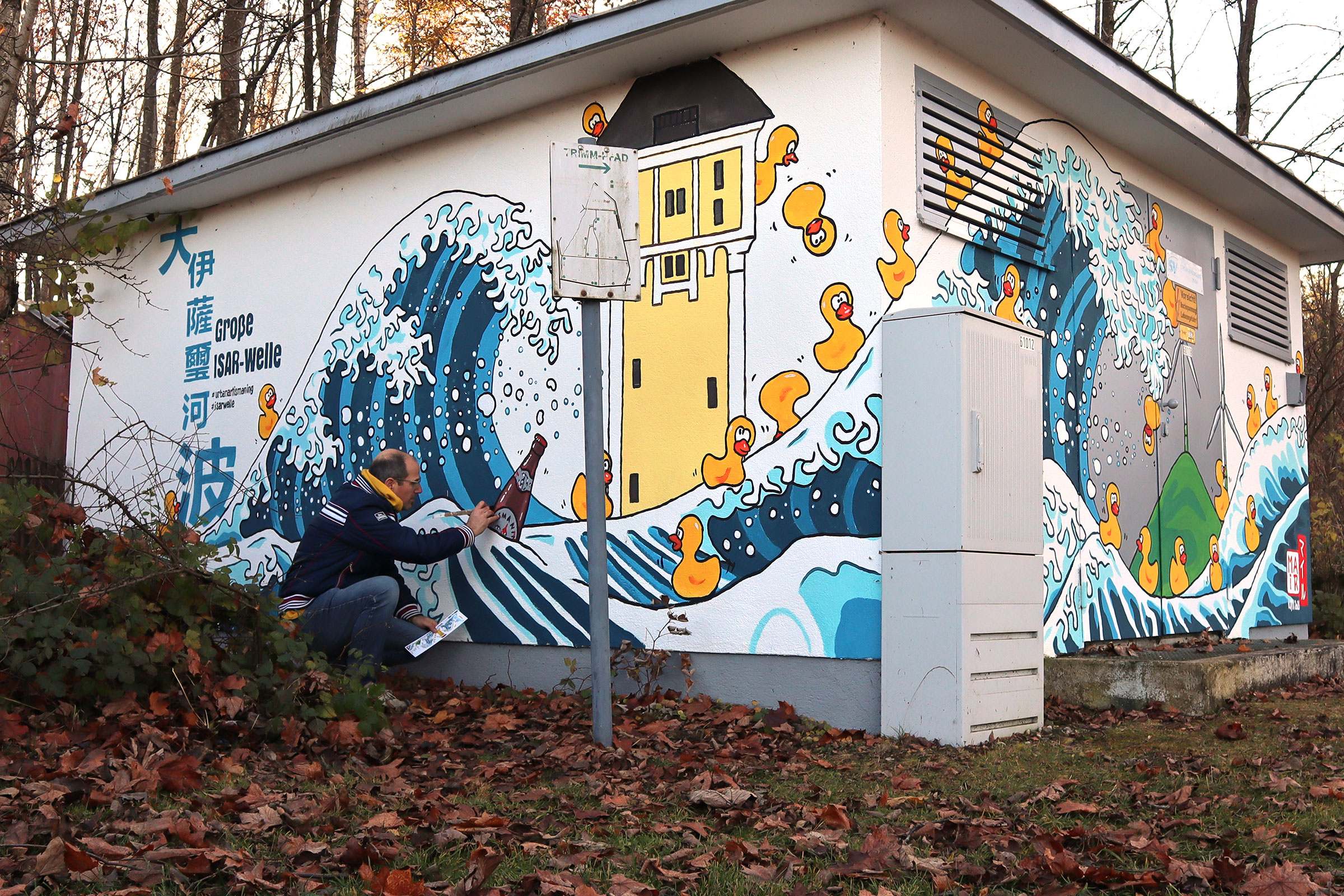 Beitrag zum UrbanArt Projekt Ismaning. Das Trafohaus am Ismaninger Eisweiher.